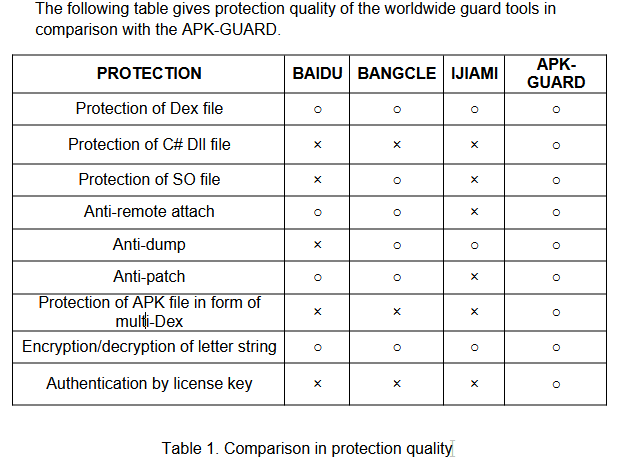 The first product mentioned in the documents is an Android application referred to as APK-GUARD which is designed to protect against the reverse engineering of Android apps. The document also includes a feature comparison table against named competitors and explicitly calls out it’s protection of C# DLL libraries as a unique differentiator compared to the other tools listed.