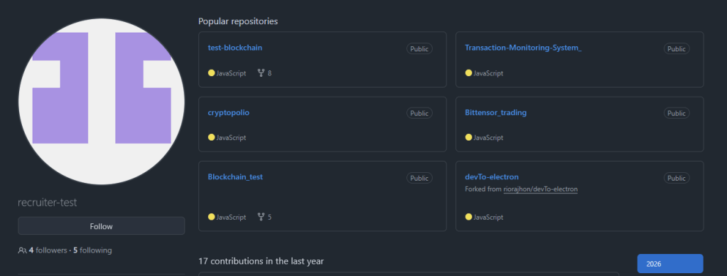 While no malicious code was discovered in any of the repositories, it does seem to be focused on part of a larger recruitment campaign. While pivoting on followers, another account tied to Nixsora, recruiter-test was discovered that has several blockchain related resting repositories.