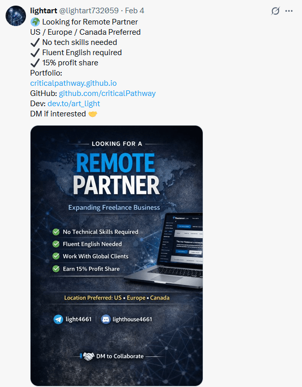 Another account associated with the cluster, lightart732059 was also posting online looking for remote workers to share profits.