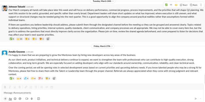 One thing that wasn’t included in the first post was screenshots of the Mentonex Slack channel. This was designed to appear to look like a legitimate company. There were messages posted about the company and a number of accounts that all appeared to be regular users.