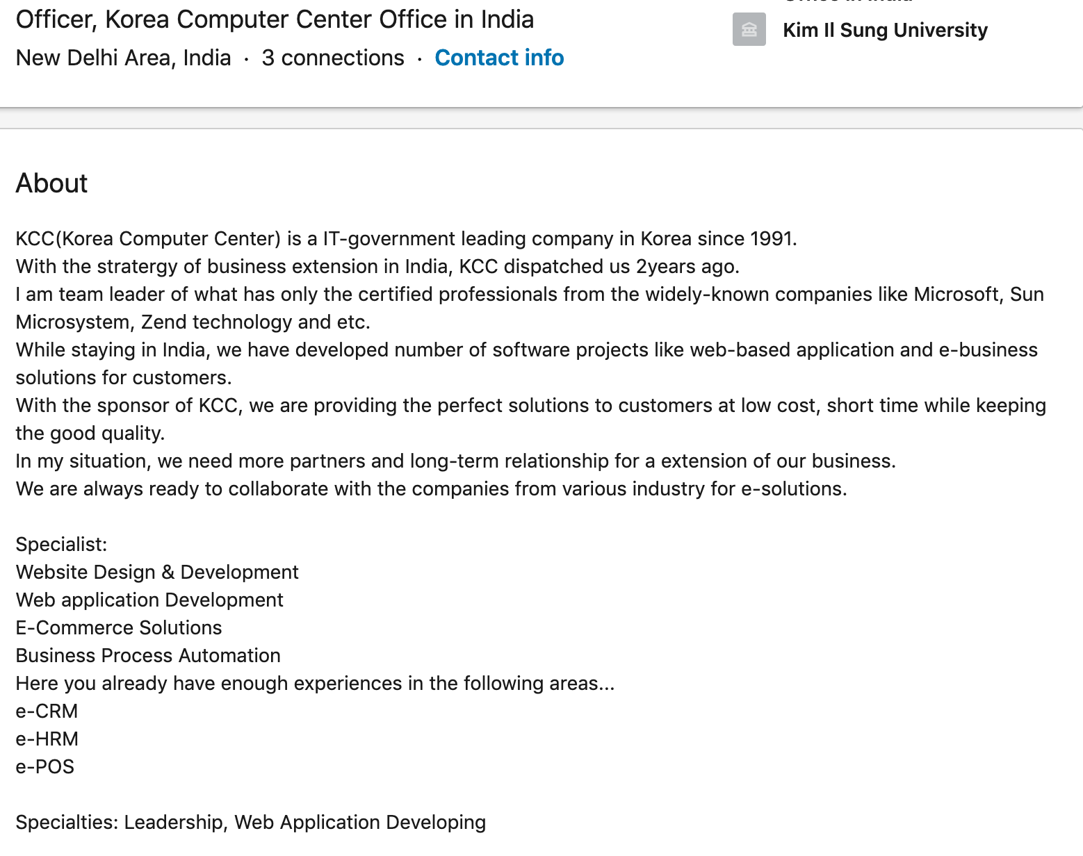 Looks like a Russian website for posting resumes. Found one for Pyongyang Gwanmen Information Technology Corporation. The one thing to note is the reverse engineering skill where they specifically mention a vaccine program.